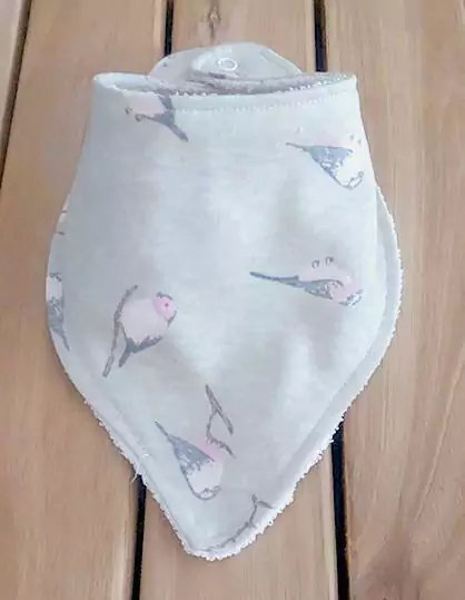 Confeccionado en interlock de algodón estampado, el babero Bandana Alondra tiene un dorso de toalla doble felpa que absorbe cualquier derrame o salpicadura.